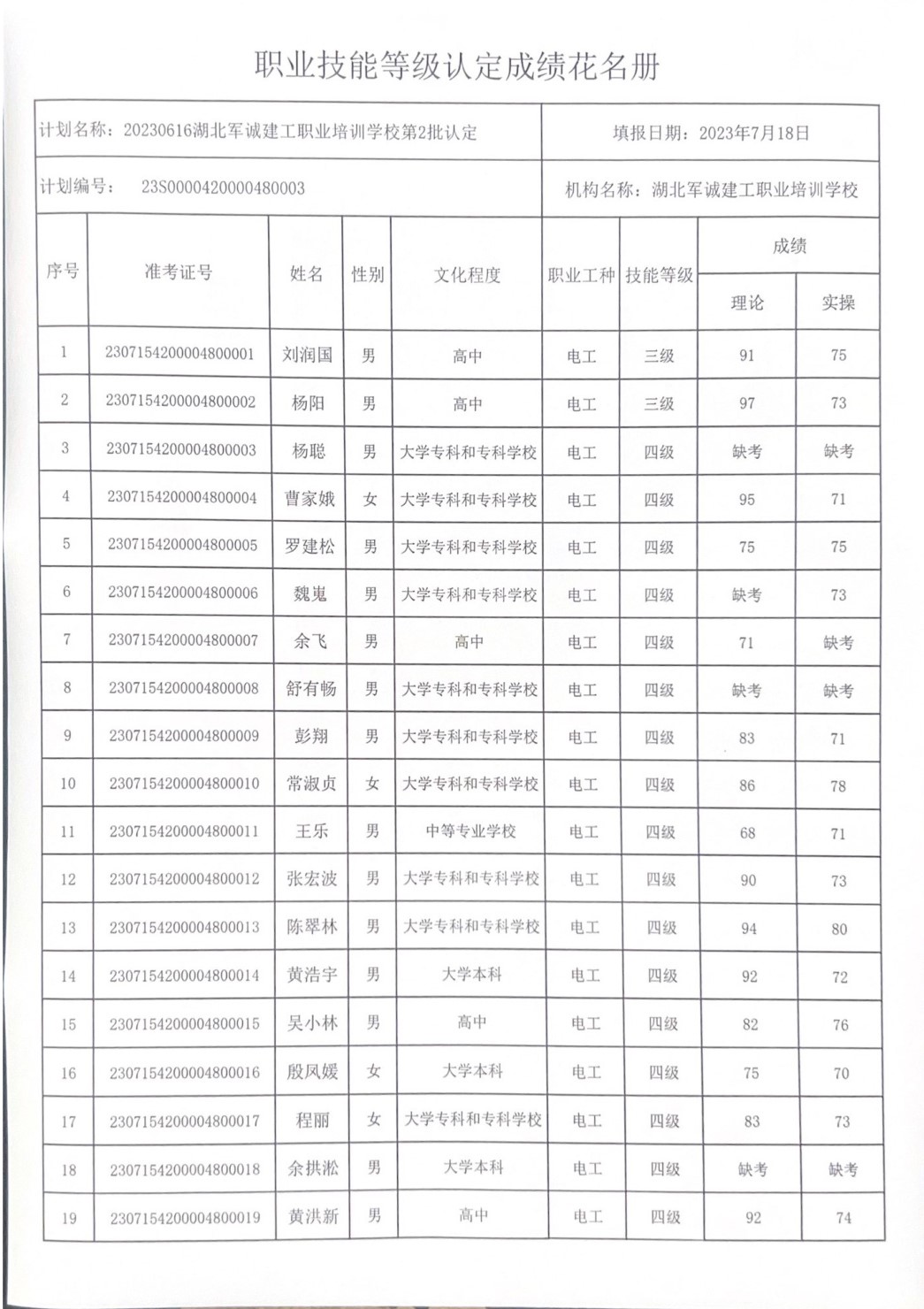 2023年第2批职业技等级认定成绩公示